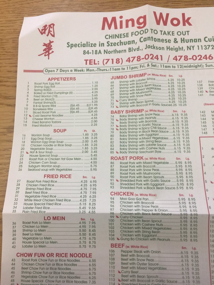 Welcome to Ming Wok, a delightful Chinese eatery nestled in the heart of Jackson Heights. This culinary gem offers a broad selection of authentic dishes, all crafted to satisfy your cravings. Whether you're dining in or opting for takeout, prepare for an unforgettable experience. Ming Wok prides itself on its diverse menu, featuring everything from aromatic stir-fries to rich noodles, making it perfect for family gatherings or casual nights out with friends.